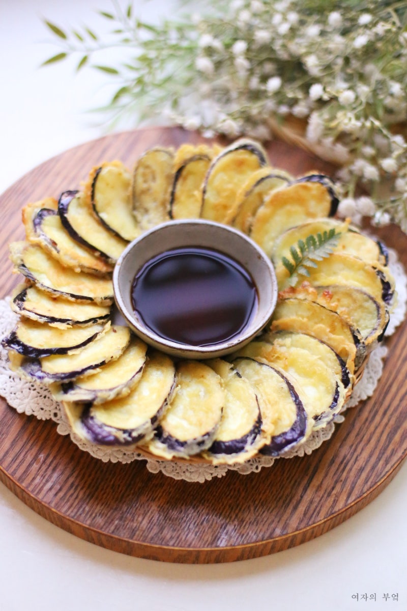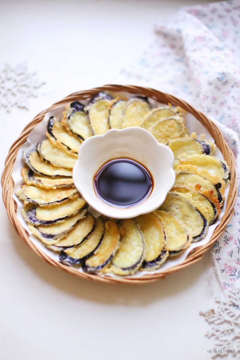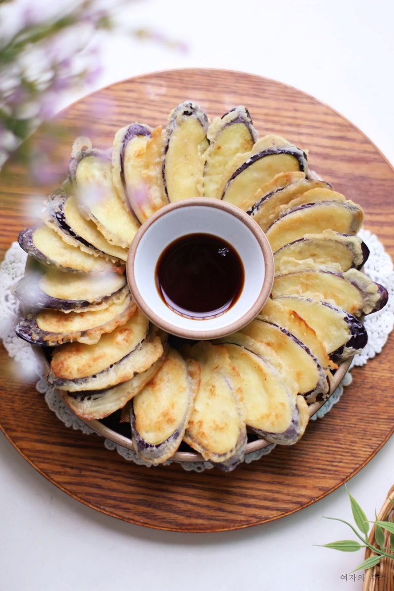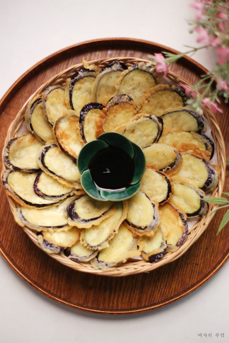 안녕하세요 야생화향기 입니다. 슈퍼마켓에서 쇼핑을 하다가 결국 가지 한 봉지를 사게 됩니다. 가격도 적당하고 맛도 좋아서 식탁에 자주 올려놓는 재료에요. 언제 먹어도 맛있는 가지전 만드는 법을 알려드릴게요. 가지 팬케이크 만드는 법을 보여 드리겠습니다. 반죽을 입히고 기름을 발라주세요. 가지튀김을 넉넉하게 코팅하고 튀겨서 만드는 방법입니다. 가지튀김소스에 찍어먹으면 정말 맛있어요~! 소스의 맛이 바삭함을 더해주어 한 번에 바삭바삭해집니다. 기름을 넉넉히 두르고 튀겨도 되지만 프라이팬에 기름을 넉넉히 두르세요. 기존처럼 튀겨주시면 기름 손실을 줄이고 바삭함을 동시에 즐기실 수 있습니다.
