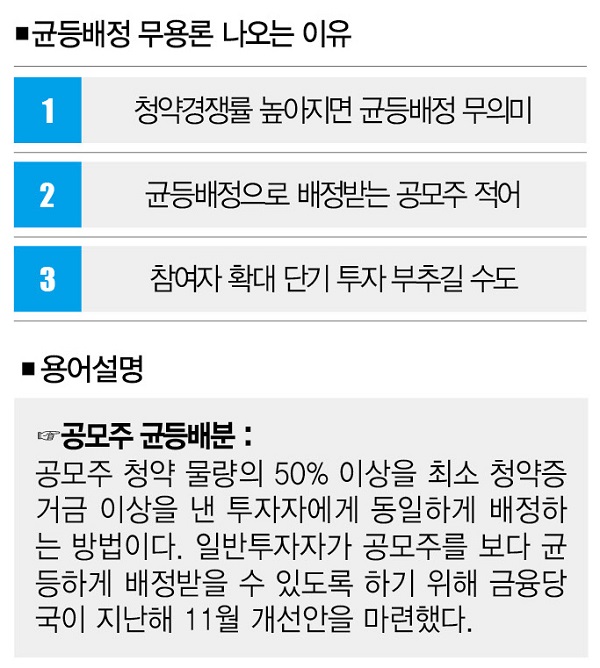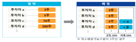 공모주(公募株)와 공모주 청약주식 시장에서 “공모(公募)”란 새롭게 발행한 주식·공사채 등 유가 증권의 인수를 널리 일반에게 공개로 모집하는 것을 뜻합니다. “청약”이란 투자자가 공개된 기업의 주식을 사겠다고 신청하는 것이며, 기업 공개 후 이 청약 사실에 따라 기업이 주식을 나누어 주는 것을 “배정”이라고 합니다. 즉 “공모주 청약”이란 신제품 출시 전 사전 예약과 비슷한 형태라고 할 수 있는데, 기업이 공개를 통해 증권 시장에 상장을 앞두고 있는 경우, 일반 투자자들에게 이를 공개하고, 상장 후 투자자들에게 주식을 나누어 주는 것입니다. 2. 새로운 공모주 청약 방식 – “균등배분” 방식의 추가