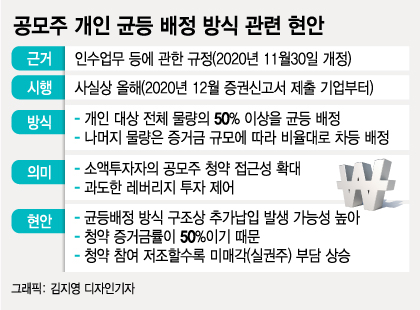 공모주(公募株)와 공모주 청약주식 시장에서 “공모(公募)”란 새롭게 발행한 주식·공사채 등 유가 증권의 인수를 널리 일반에게 공개로 모집하는 것을 뜻합니다. “청약”이란 투자자가 공개된 기업의 주식을 사겠다고 신청하는 것이며, 기업 공개 후 이 청약 사실에 따라 기업이 주식을 나누어 주는 것을 “배정”이라고 합니다. 즉 “공모주 청약”이란 신제품 출시 전 사전 예약과 비슷한 형태라고 할 수 있는데, 기업이 공개를 통해 증권 시장에 상장을 앞두고 있는 경우, 일반 투자자들에게 이를 공개하고, 상장 후 투자자들에게 주식을 나누어 주는 것입니다. 2. 새로운 공모주 청약 방식 – “균등배분” 방식의 추가