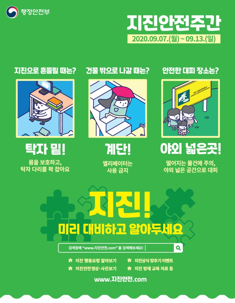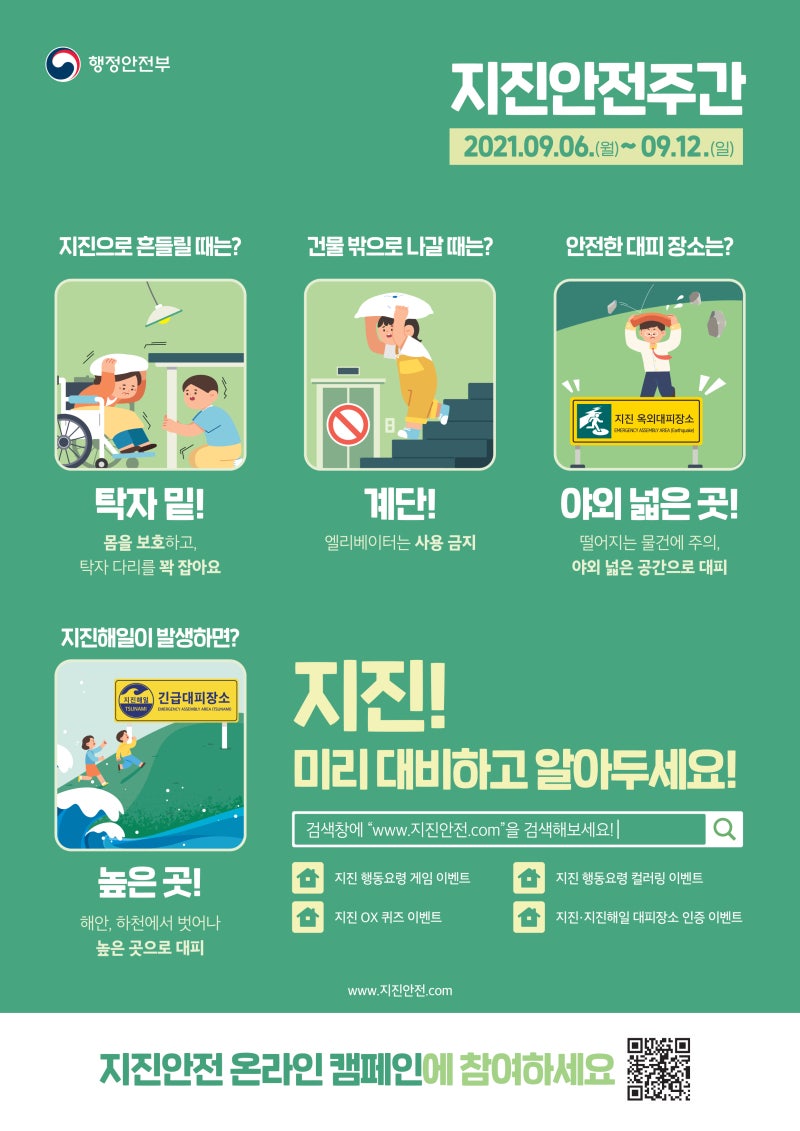 학교에 있는 동안 지진이 발생하면 즉시 책상 밑으로 들어가 양쪽 책상 다리를 붙잡고 몸을 보호하세요. 흔들림이 멈추면 선생님의 지시에 따라 질서를 유지하며 운동장으로 대피하세요. 복도 창문 유리가 깨질 위험이 있으니 창문에서 멀리 떨어지세요. 사무실에 있을 때에는 무거운 물건, 특히 컴퓨터나 모니터가 많아 부상의 위험이 있으므로 사무실 책상 밑으로 들어가 웅크리고 책상 다리를 꽉 잡아 몸을 보호하세요. 건물이 높을수록 흔들림이 심해 장시간 지속될 수 있으니 낙하물에 주의하세요. 아파트 등 고층건물 내부에서는 지상보다 흔들림이 더 크고 오래 지속될 수 있으므로 실내에서는 낙하물에 더욱 주의해야 합니다. 테이블 밑으로 몸을 숨기고 흔들림이 멈출 때까지 기다리세요. 대피 중에는 엘리베이터를 절대 사용해서는 안 됩니다. 백화점이나 슈퍼마켓에 있을 때 진열장에서 떨어지는 물건으로부터 몸을 보호하세요. 들고 다니는 가방이나 장바구니 등으로 머리를 보호하는 것이 좋습니다. 또한, 계단이나 기둥 근처에 머물고, 흔들림이 멈추면 밖으로 대피하세요. 지하철이나 기차 안에서는 비상정차에 대비해 자세를 낮추거나 넘어지지 않도록 난간이나 난간을 꽉 잡으세요. 좌석에 앉을 경우에는 가방 등으로 머리를 보호하세요. 열차가 정차하면 침착하게 행동하고 차장의 안내나 지시에 따릅니다. 운전 중에 지진이 발생하면 먼저 비상등을 켜고 서서히 속도를 줄여 도로 오른쪽에 주차하세요. 긴급 차량을 위해 도로 중앙을 비워두고, 이동하기 전에 문을 잠그지 않고 열쇠를 제자리에 두십시오. 엘리베이터 안에 있는 동안 지진이 발생하면 먼저 모든 층의 버튼을 누르세요. 그 후, 정차하는 1층에서 하차하세요. 정지층에서 하차하기 전 복도가 안전한지 확인한 후 대피해야 합니다. 엘리베이터에 갇히게 되면 인터폰이나 휴대전화를 이용해 침착하게 구조를 기다리세요. 해안에 있을 때 흔들림을 느낀다면 쓰나미에 대비해야 합니다. 최대한 빨리 해안을 떠나 안전한 고지나 지정된 대피소로 대피하시기 바랍니다. 대피할 시간이 없을 경우에는 근처에 있는 3층 이상의 튼튼한 건물 옥상으로 대피하세요. 특히 쓰나미 파도는 한번의 큰 파도로 끝나지 않고 몇 시간에 걸쳐 여러 번 반복될 수 있으므로 쓰나미 경보가 해제될 때까지 낮은 곳으로 이동하지 마십시오. 산에 있을 때에는 낙석에 주의하고, 굴러떨어지거나 큰 산사태가 일어날 수 있는 바위나 바위로부터 멀리 대피하세요. 지진으로 지반이 약해지면 쉽게 무너지기 쉬우므로 절벽이나 급경사 등 위험한 장소에는 접근하지 마세요. 먼 나라에서만 일어날 줄 알았던 지진이 최근 우리나라에서도 자주 발생하고 있습니다. 오늘 발표한 지진 발생 시 행동요령을 숙지하시고 미리 준비하시기 바랍니다. 또한, 국가재난안전포털을 통해 인근 지진 대피소와 지진 발생 시 임시 주거시설 정보를 확인할 수 있다. 집이나 직장에서 가까운 피난소를 미리 알아보세요! ▼ 국가재난안전포털 바로가기 ▼ 국가재난안전포털 www.safekorea.go.kr