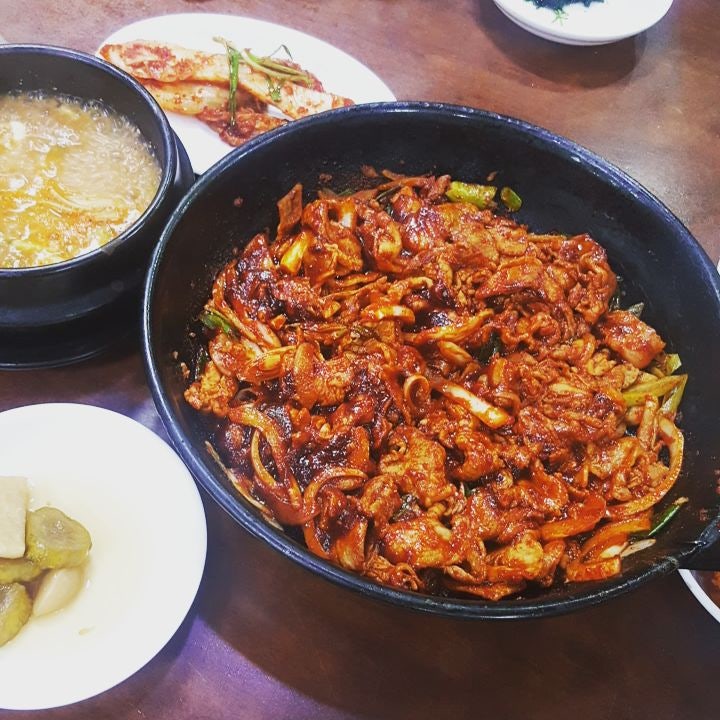 식당 입구부터 연예인 사인들이 줄지어 서있습니다~~~~~~ 식당에 들어가니 4인용 테이블이 6개 있어요! 12시가 되니 벌써 만석! 사장님, 어디 계시나요!!!! ㅠㅠ계단으로 올라가면 자리가 또 있어요! 1층에 자리가 없으면 신발을 벗고 2층에 앉으세요! 우와!!! 1층 레스토랑으로 입장! 셀프 반찬 바! 준비가 된! 반찬이 부족해요! 여기를 채워주세요! 하하, 단연 최고입니다! 불백정식으로 주문해주세요!! ㅎㅎ 물셀프! 추가 반찬도 셀프로 드실 수 있어요! 밥 추가시 1,000원! 연예인 싸인이 벽을 가득 채웠어요!!!! 감독 이준익, 박정민, 김주혁, 유노윤호, 김정태, 유준상, 코요태 등 불백정식(10,000원/인) _ 2인분 주문제작 레스토랑이라 음식이 확실히 빨리 준비되더라구요!! 불백의 비주얼을 보자마자 젓가락을 집으러 달려가게 될 것 같아요! 하하, 매워요! 너무 맛있는 불백! 고기가 많이 들어있어서 인색하지 않아도 돼요! 100점 만점에 100점!!! ㅎㅎ 고기가 많은데 여기는 살코기가 꽤 많아요! 그래서 내 입에 딱! 좋은!!! ㅎㅎ 빨간 소스에 비해 그렇게 맵지는 않으니 놀라지 마세요! ㅎㅎㅎ 불백정식_ 돼지불고기+된장찌개+밥은 광고 이후 계속됩니다. 다음 주제 작성자 취소 부산 루머 불백 재생 0 좋아요 0 좋아요 공유 0:00:00 재생 음소거 00:00 00:00 실시간 설정 전체 화면 해상도 currentTrack 자막 비활성화 재생 속도 NaNx 해상도 자막 설정 비활성화 옵션 글꼴 크기 배경색 재생 속도 0.5x 1.0x(기본값) 1.5x 2.0x 알 수 없는 오류가 발생했습니다. 도움말이 음소거되었습니다. 도움말 라이센스 이 영상은 고화질로 재생할 수 있습니다. 설정에서 해상도를 변경해보세요. 자세히 보기 0:00:00 Collapse/Expand부산의 명물 불백_부산의 명물 불백정식부산의 명물 불백 #초량 가볼만한 곳 #초량명소 #명명불백 #부산명물불백 #초량불백 #초량명물불백 #초량맛집 #돼지불고기 # 불백 정식 #초량돼지불백 기본요리 _ 고추장볶음, 어묵, 미역, 바다달팽이 기본요리 _ 콩나물양념, 무나물, 김치 기본요리 _ 상추, 고추, 마늘, 쌈장 불백은 환상의 조합 양파와 고기가 적절하게 섞여있어요! 삐뚤어진 프라이팬이 더 맛있어보이네요… . ㅎㅎ 뭐죠.. 1차 _ 상추에 꼭! 감사합니다! 너무 맛있어요. ㅎㅎ 2차_ 밥이랑 비비면 더 맛있어요! 하하, 이게 뭐죠? 공지밥은 고봉밥이에요! ㅎㅎ 된장찌개도 같이 나오네요! 내 입맛에 딱! 두부, 호박, 양파, 팽이버섯까지! 모든 것이 들어있는 된장찌개! ㅎㅎ 그 유명한 불백을 몇년만에 방문했어요! 그때 먹었던 그 맛! 그대로 남아있어서 더욱 기뻐요! ㅎㅎ 기사님들을 위한 24시간 식당으로 유명한데, 단골손님이 더 많았어요! 불백으로 유명한 집! 부산역과 매우 가까워서 정규식사가 그리우시다면 정말 좋아요! 찐! 분명히! 한번 시도해 보시길 권합니다! ㅎㅎㅎ ——————–★메뉴 ★——————-24. 1. 2 기준 50m NAVER Corp. 더 보기 /OpenStreetMap 지도 데이터 x NAVER Corp. /OpenStreetMap Map Controller Legend Real Estate 산오리읍, 도청 구시군 동시 부산광역시 동구 초량로 36 주소 : 부산 동구 초량로 36 주차 : 가능 (식당 앞 공영주차장 이용 / 현금 결제시 2인 주차권 1매) 마켓) 영업시간 : 24시간 (00:00~24:00) 전화 : 051-464-0846 단체 이용 가능