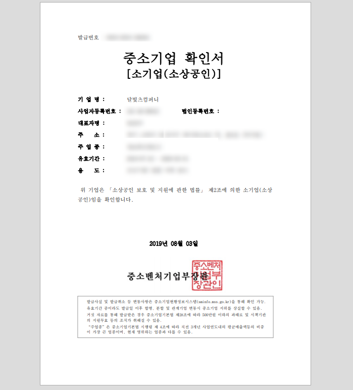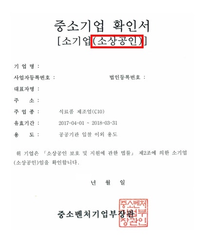 상시근로자수가 5인 (제조,광업,건설,운송업은 10인)미만이며,중소기업기본법 별표에 따른 소기업 매출 기준 (예) 음식업 10억 이하, 도소매업 50억 이하)에 해당 하는 사업체를 말한다. (비영리는 제외함)발급기관은 소상공인시장진흥공단 (www.semas.or.kr) ,발급방법은 온라인 소상공인시장진흥공단 홈페이지 또는 소상공인지역센터에서 방문에서 발급 받을 수 있다.