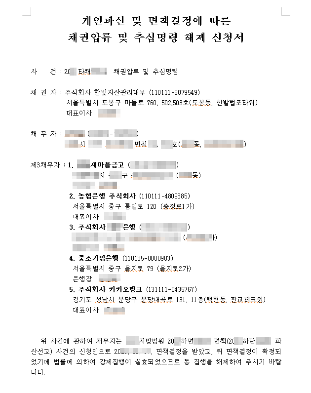 통장 압류 사유 및 해제 조건 개인 회생채무 구제 신청 비용 통장 압류 사유 및 해제 조건 비용 개인 회생 채무 구제 신청 통장 압류 사유 및 해제 조건 개인 회생 채무 구제 신청 경제적 어려움이 있거나 채무를 갚을 수 없는 경우 채권자는 채무자의 자산을 압류할 수 있습니다. 압수될 수 있습니다. 지금 가장 먼저 압수해야 할 것 중 하나가 통장이다. 통장이 압수되면 생활비 및 금융거래에 지장이 발생하여 매우 어려운 상황에 처하게 됩니다. 이번 시간에는 통장이 압수되는 이유와 해결방안에 대해 알아보겠습니다. 확인하고 싶습니다. 1. 통장압류란 무엇인가요? 채무자가 돈을 갚지 않으면 채권자는 채무자의 은행계좌를 압류할 수 있다. 이를 ‘통장압류’라고 합니다. 이런 일이 발생하면 채무자는 은행에서 돈을 인출하거나 송금이 불가능해집니다. 뿐만 아니라 신용카드 결제도 불가능해졌습니다. 이로 인해 채무자는 많은 경제적 어려움을 겪을 수밖에 없었습니다. 2. 은행계좌 압류절차는 어떻게 되나요? 먼저, 법원에 지출 명령을 신청하고 지정을 받습니다. 이를 입수한 후 2주 이내에 이의가 없으면 결정한다. 집행권을 확보함으로써 모든 시중은행 본점 또는 지점에 압류명령이 내려진다. 제공됩니다. 이제부터 채무자의 모든 금융거래가 차단됩니다. 그러나 급여, 생활비 등 기본생활비를 최대 185만원까지 압류하는 것을 금지한다는 취지에서 긴급소방은 이제 진압될 수 있게 됐다. 있지만 다른 값을 찾을 수 없습니다. 3. 은행계좌 압수시 최저생계비가 보장되나요? 예, 그렇습니다. 국민생활보장법 제35조는 수급자에게 지급한 물품과 이를 취득할 권리를 압류할 수 없다고 규정하고 있다. 민사집행법 시행령에 따르면 1개월 최소생활비인 185만원 미만의 보관을 압류금지채권으로 지정해 150만원이 아닌 최대 185만원까지 가능하기 때문이다. 백만 원. 이제 보호를 받을 수 있게 됩니다. 그러므로 기본적인 생활을 이어가는 데에는 문제가 없을 것입니다. 4. 은행계좌 압류를 취소하는 4가지 방법. 먼저, 승인결정 통보일로부터 14일이 지나면 신분증을 가지고 전국 어느 지역이든 방문이 가능합니다. 즉시 압수취소 신청서를 제출하고 석방수수료를 납부하면 보통 1주일 이내에 해결되며 재난조사를 통해 검토할 수 있습니다. 압수해제 통지서를 받아 각 압수사법관을 방문하여 압수문제를 해결하시면 됩니다. 문제를 해결할 수 있습니다. 두 번째로 전액을 납부한 경우 먼저 거래하는 은행을 방문하여 잔액 증명서를 받으십시오. 또한, 대법정 홈페이지에 접속하여 공익 > 식품 > 검색어(압수해제)를 입력하여 신청하시기 바랍니다. 1개의 서류를 다운로드 받은 후 해당 서류를 모아 관할 법원 민원부나 종합민원실에 가서 접수하면 됩니다. 3차 가압류가 설정된 경우 위의 두 번째 방법으로 진행하시면 됩니다. 4차 징수명령 판결문 사본(억제집행정지 종합서)을 받은 후 6개월 이내에 변제를 완료한 경우에는 억제집행취소신청서를 작성하고 첨부서류를 함께 구비하여 법원에 제출 담당 및 기타 소송 접수 데스크. 7~10일정도 소요되는 점 참고해주세요. 그렇게 해주세요. 5. 개인회생을 통해 은행계좌 압류취소가 가능한가요? 가능합니다. 정지·금지명령은 개시 시점부터 효력이 발생하므로, 이미 압수된 자라도 승인결정서, 채권자목록 등 필요한 서류를 지참하면 압류의 취소 또는 취소를 신청할 수 있습니다. 다만, 중요한 점은 승인결정 통지일로부터 14일이 지나면 법적 효력이 발생한다는 점을 명심해야 한다. 6. 개인파산으로 인한 은행계좌압류 취소가 가능한가요? 예. 면제선언 전이라도 ‘파산선고’만 하면 계류 중이라고 하는 각종 압류를 풀어주기엔 충분하다. 보증금을 납부하고 수탁자를 선임하면 즉시 자산전환과 확인이 이루어지는데, 그와 별개로 가장 먼저 해야 할 일은 ‘정지명령’을 발부하는 것이다. ” 어플이기 때문에, 어떻게 하면 추가 발작이 들어오는 것을 방지하고, 기존 발작을 한꺼번에 풀어줄 수 있는 방법은 적극적으로 반영해주시기 바랍니다. 물론, 분명한 것은 당신의 상황뿐입니다. 사건에 따라 다를 수 있으므로 반드시 법률전문가와 상담하시는 것이 좋습니다. 은행 계좌 압류로 인해 어려움을 겪고 계시다면 법률적인 도움을 받아 해결할 수 있는 방법이 있습니다. 이것을 잘 적용하면 어려운 시기에도 새로운 출발을 할 수 있으니 적극적으로 살펴보고 대처해 나가시기 바랍니다. 나는 당신이 그렇게 하기를 바랍니다. 통장압류 사유 및 해제조건. 개인 회생 채무 구제 신청 비용. 개인회생채무구제 신청사유 및 해제조건 개인회생채무구제 신청사유 및 해제조건 개인회생채무구제 신청사유 및 해제조건 개인회생채무구제 신청사유 및 해제조건 개인회생채무구제신청서입니다.