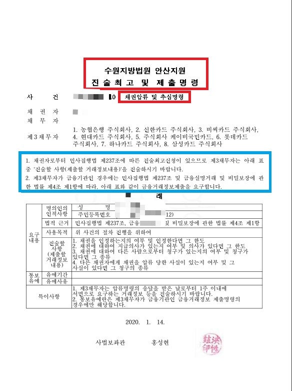 통장 압류 사유 및 해제 조건 개인 회생채무 구제 신청 비용 통장 압류 사유 및 해제 조건 비용 개인 회생 채무 구제 신청 통장 압류 사유 및 해제 조건 개인 회생 채무 구제 신청 경제적 어려움이 있거나 채무를 갚을 수 없는 경우 채권자는 채무자의 자산을 압류할 수 있습니다. 압수될 수 있습니다. 지금 가장 먼저 압수해야 할 것 중 하나가 통장이다. 통장이 압수되면 생활비 및 금융거래에 지장이 발생하여 매우 어려운 상황에 처하게 됩니다. 이번 시간에는 통장이 압수되는 이유와 해결방안에 대해 알아보겠습니다. 확인하고 싶습니다. 1. 통장압류란 무엇인가요? 채무자가 돈을 갚지 않으면 채권자는 채무자의 은행계좌를 압류할 수 있다. 이를 ‘통장압류’라고 합니다. 이런 일이 발생하면 채무자는 은행에서 돈을 인출하거나 송금이 불가능해집니다. 뿐만 아니라 신용카드 결제도 불가능해졌습니다. 이로 인해 채무자는 많은 경제적 어려움을 겪을 수밖에 없었습니다. 2. 은행계좌 압류절차는 어떻게 되나요? 먼저, 법원에 지출 명령을 신청하고 지정을 받습니다. 이를 입수한 후 2주 이내에 이의가 없으면 결정한다. 집행권을 확보함으로써 모든 시중은행 본점 또는 지점에 압류명령이 내려진다. 제공됩니다. 이제부터 채무자의 모든 금융거래가 차단됩니다. 그러나 급여, 생활비 등 기본생활비를 최대 185만원까지 압류하는 것을 금지한다는 취지에서 긴급소방은 이제 진압될 수 있게 됐다. 있지만 다른 값을 찾을 수 없습니다. 3. 은행계좌 압수시 최저생계비가 보장되나요? 예, 그렇습니다. 국민생활보장법 제35조는 수급자에게 지급한 물품과 이를 취득할 권리를 압류할 수 없다고 규정하고 있다. 민사집행법 시행령에 따르면 1개월 최소생활비인 185만원 미만의 보관을 압류금지채권으로 지정해 150만원이 아닌 최대 185만원까지 가능하기 때문이다. 백만 원. 이제 보호를 받을 수 있게 됩니다. 그러므로 기본적인 생활을 이어가는 데에는 문제가 없을 것입니다. 4. 은행계좌 압류를 취소하는 4가지 방법. 먼저, 승인결정 통보일로부터 14일이 지나면 신분증을 가지고 전국 어느 지역이든 방문이 가능합니다. 즉시 압수취소 신청서를 제출하고 석방수수료를 납부하면 보통 1주일 이내에 해결되며 재난조사를 통해 검토할 수 있습니다. 압수해제 통지서를 받아 각 압수사법관을 방문하여 압수문제를 해결하시면 됩니다. 문제를 해결할 수 있습니다. 두 번째로 전액을 납부한 경우 먼저 거래하는 은행을 방문하여 잔액 증명서를 받으십시오. 또한, 대법정 홈페이지에 접속하여 공익 > 식품 > 검색어(압수해제)를 입력하여 신청하시기 바랍니다. 1개의 서류를 다운로드 받은 후 해당 서류를 모아 관할 법원 민원부나 종합민원실에 가서 접수하면 됩니다. 3차 가압류가 설정된 경우 위의 두 번째 방법으로 진행하시면 됩니다. 4차 징수명령 판결문 사본(억제집행정지 종합서)을 받은 후 6개월 이내에 변제를 완료한 경우에는 억제집행취소신청서를 작성하고 첨부서류를 함께 구비하여 법원에 제출 담당 및 기타 소송 접수 데스크. 7~10일정도 소요되는 점 참고해주세요. 그렇게 해주세요. 5. 개인회생을 통해 은행계좌 압류취소가 가능한가요? 가능합니다. 정지·금지명령은 개시 시점부터 효력이 발생하므로, 이미 압수된 자라도 승인결정서, 채권자목록 등 필요한 서류를 지참하면 압류의 취소 또는 취소를 신청할 수 있습니다. 다만, 중요한 점은 승인결정 통지일로부터 14일이 지나면 법적 효력이 발생한다는 점을 명심해야 한다. 6. 개인파산으로 인한 은행계좌압류 취소가 가능한가요? 예. 면제선언 전이라도 ‘파산선고’만 하면 계류 중이라고 하는 각종 압류를 풀어주기엔 충분하다. 보증금을 납부하고 수탁자를 선임하면 즉시 자산전환과 확인이 이루어지는데, 그와 별개로 가장 먼저 해야 할 일은 ‘정지명령’을 발부하는 것이다. ” 어플이기 때문에, 어떻게 하면 추가 발작이 들어오는 것을 방지하고, 기존 발작을 한꺼번에 풀어줄 수 있는 방법은 적극적으로 반영해주시기 바랍니다. 물론, 분명한 것은 당신의 상황뿐입니다. 사건에 따라 다를 수 있으므로 반드시 법률전문가와 상담하시는 것이 좋습니다. 은행 계좌 압류로 인해 어려움을 겪고 계시다면 법률적인 도움을 받아 해결할 수 있는 방법이 있습니다. 이것을 잘 적용하면 어려운 시기에도 새로운 출발을 할 수 있으니 적극적으로 살펴보고 대처해 나가시기 바랍니다. 나는 당신이 그렇게 하기를 바랍니다. 통장압류 사유 및 해제조건. 개인 회생 채무 구제 신청 비용. 개인회생채무구제 신청사유 및 해제조건 개인회생채무구제 신청사유 및 해제조건 개인회생채무구제 신청사유 및 해제조건 개인회생채무구제 신청사유 및 해제조건 개인회생채무구제신청서입니다.