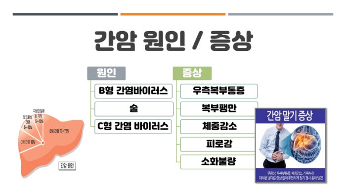 간암은 우리나라 암사망률 2위의 위험한 암으로 간에서 발생하는 원발성 악성종양으로 장기로 흐르는 혈액이 모이는 곳으로 체내의 에너지 관리를 담당 . 간암은 단일관암, 간세포암, 혈관육종 등으로 나뉘는데, 그 중 우리나라에서 간세포암의 발생률은 74.5%로 높다.이유