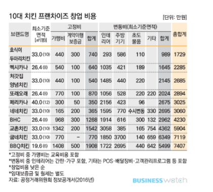 이런 관점에서 비교해보면 창업하기 좋은 프랜차이즈 중 하나가 모두의 사랑스러운 치킨이다.